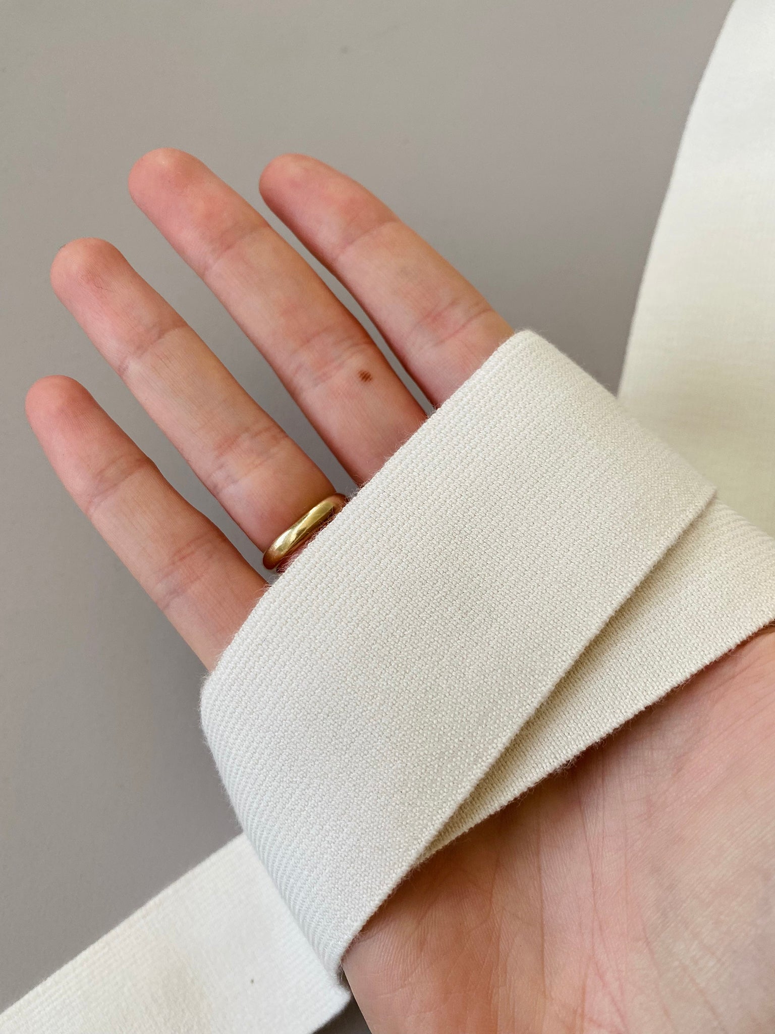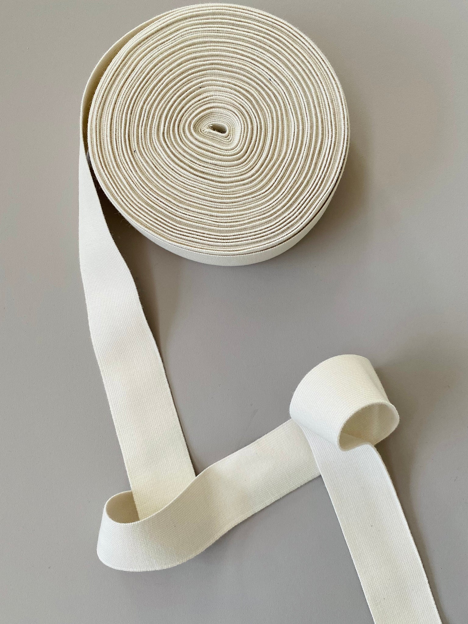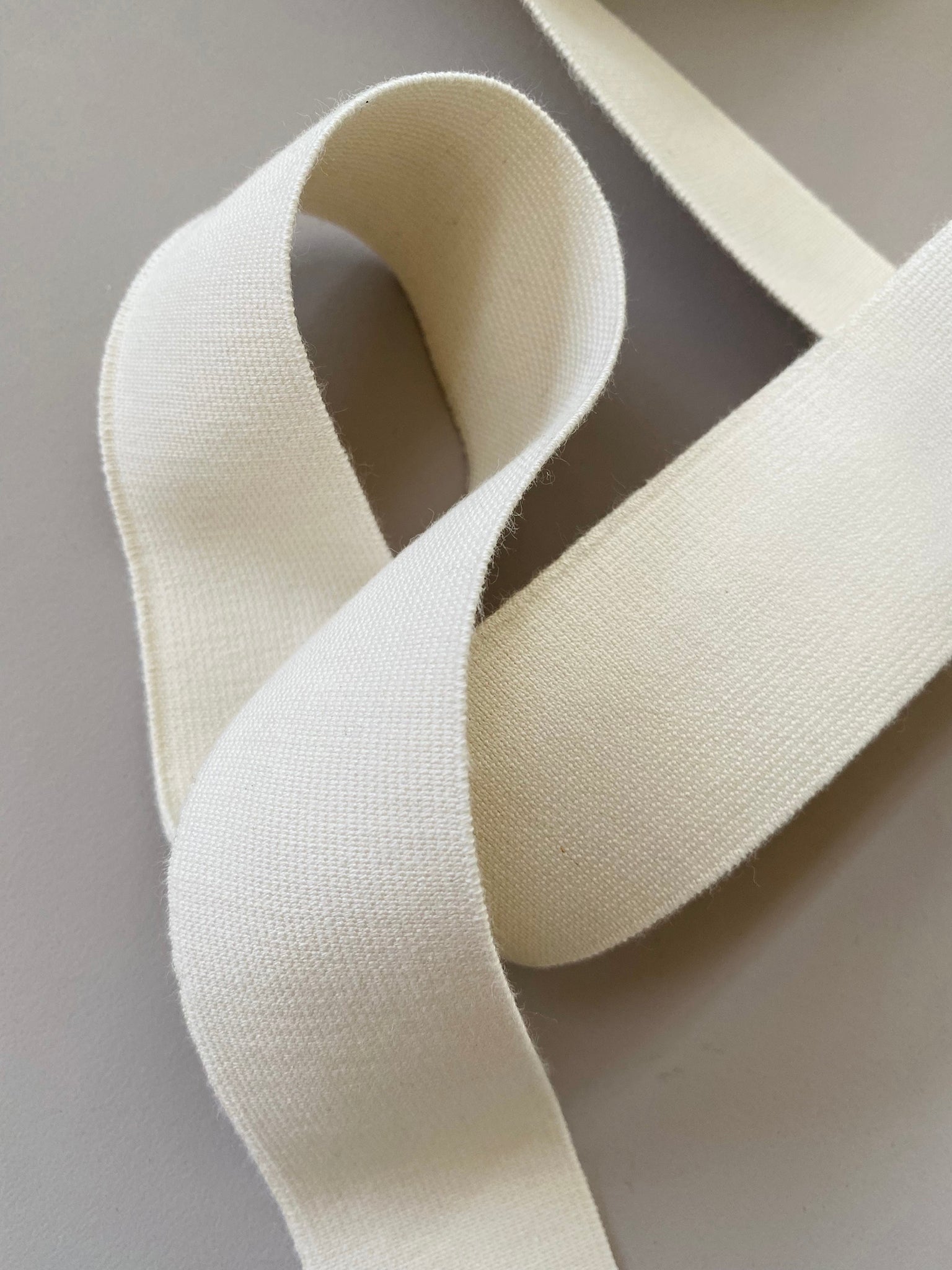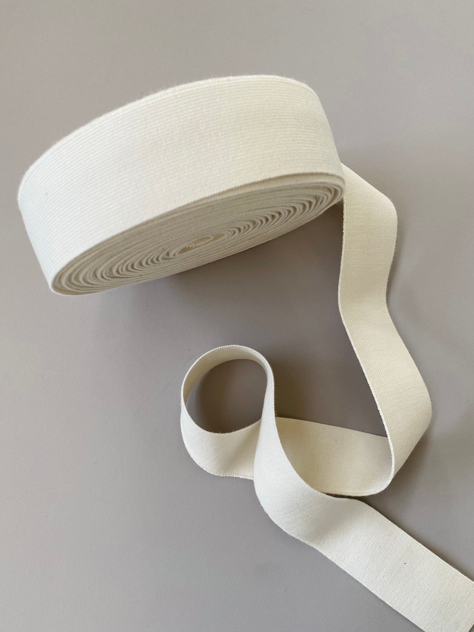 This elastic is pliable and soft to touch, with just enough rigidity. Perfect for soft elasticated hems/cuffs or waistbands. It's absolutely beautiful elastic due to the GOTS organic cotton component!